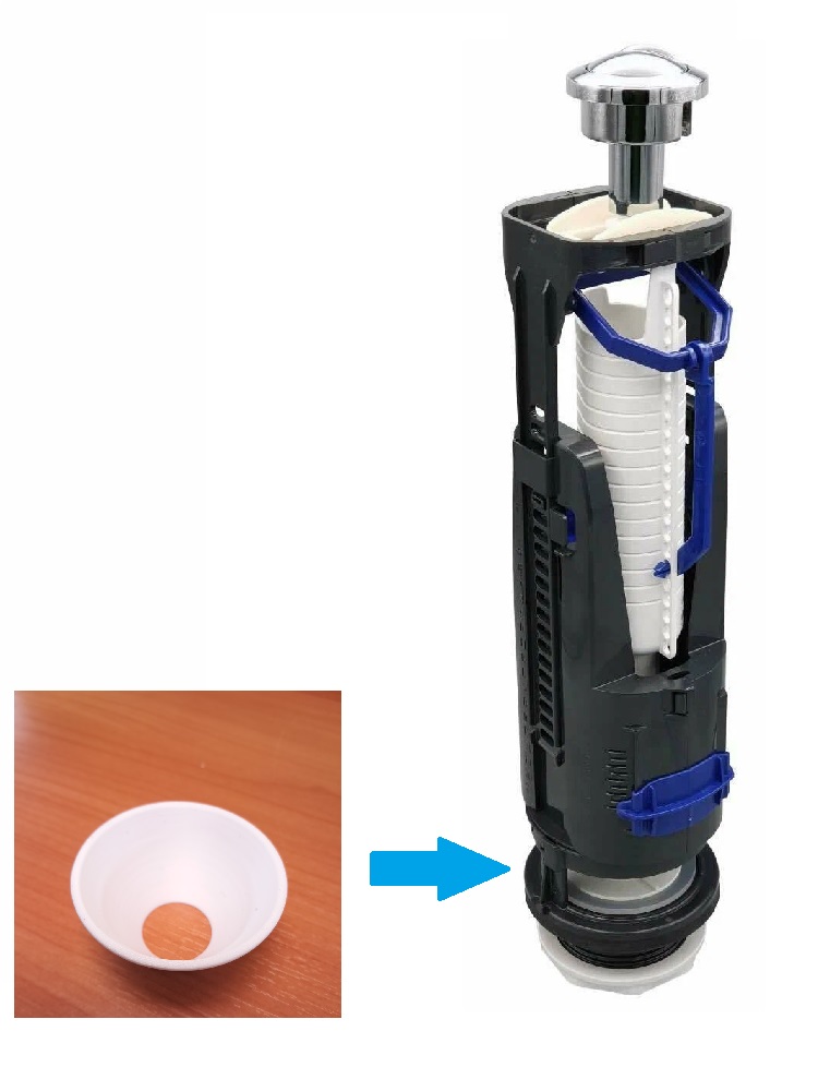 Ограничитель устанавливается в седло сливной арматуры под запорную прокладку. Через бачок (без демонтажа).
